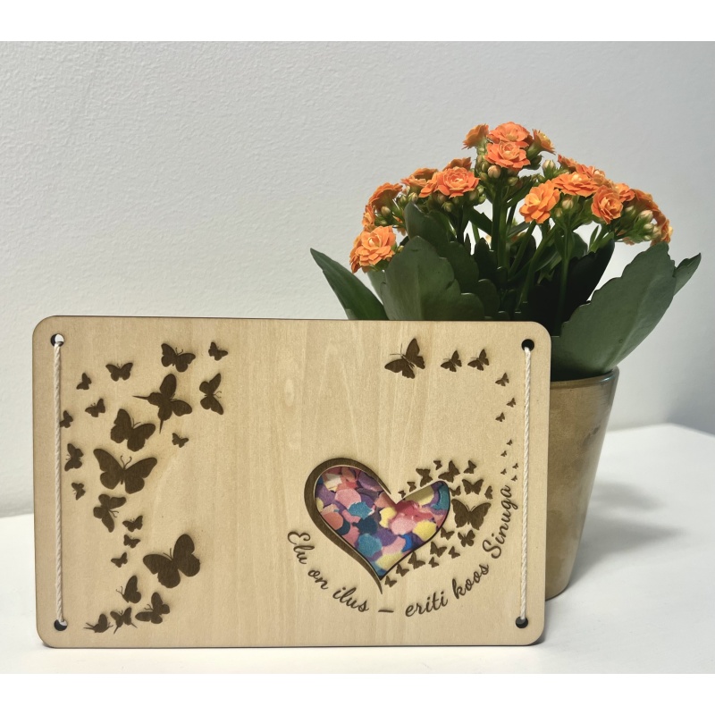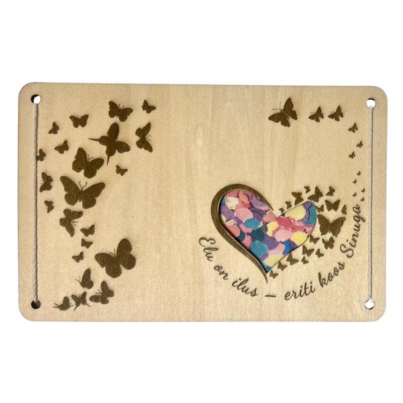 Südamlik ja tähenduslik puidust kaart eriliste hetkede tähistamiseks. Kaarti kaunistavad õrnad liblikad ja südamekujuline ava, mis võimaldab nähtavalt ja efektse disainielemendina kinkida raha või kinkekaardi. Lisa lihtsalt rahatäht või sobiva mustriga paber kahe kihi vahele – ja kingitus räägib enda eest.