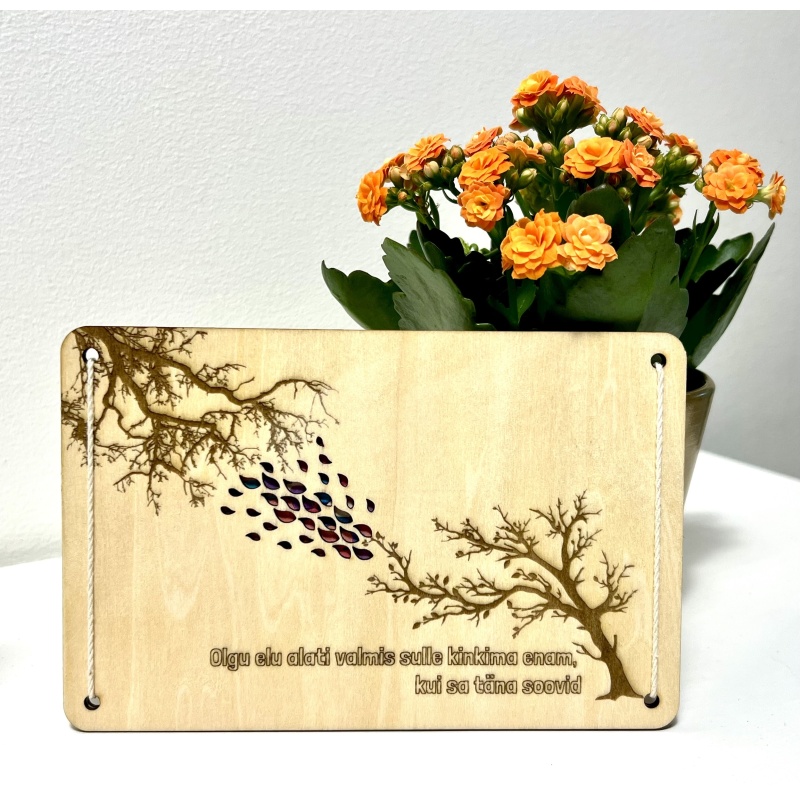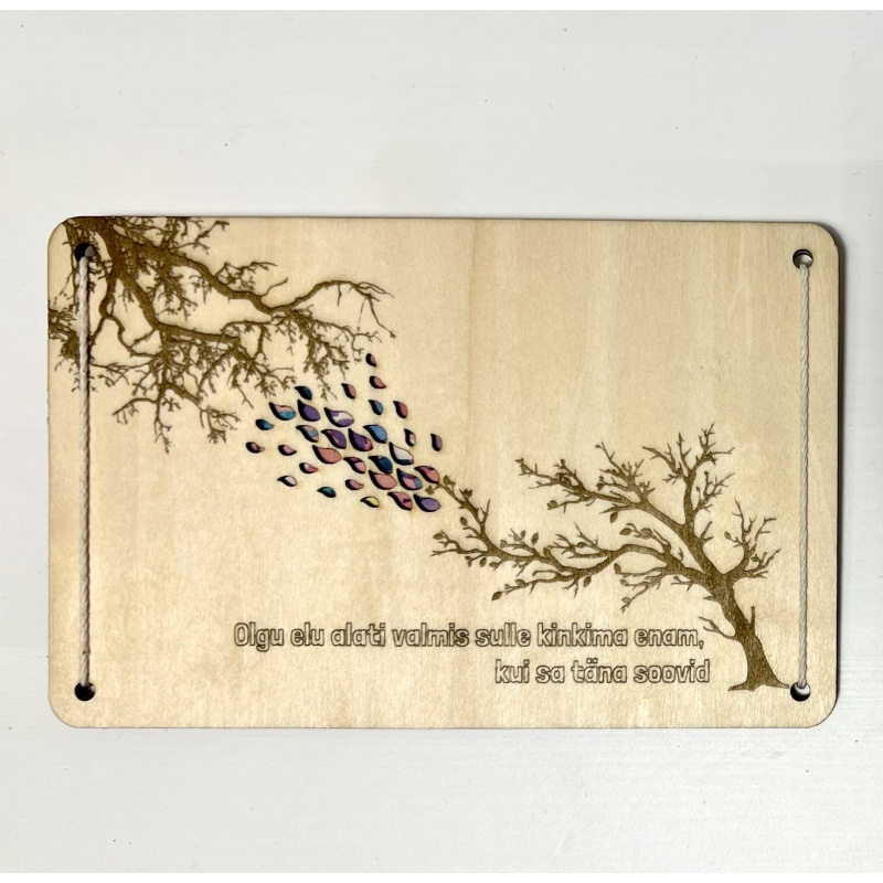 Sümboolne ja tähenduslik puidust kaart eriliste hetkede tähistamiseks. Kaarti kaunistavad puuoksad ja langevad lehed – kujund, mis kannab endas kasvu, muutuste ja unistuste täitumise sümbolit.