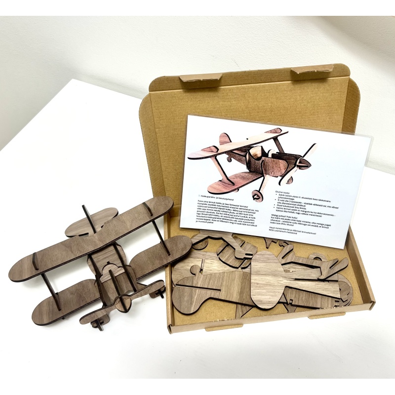 Puidust kokkupandav lennukimudel pähklivineerist. Liimivaba kokkupanek, naturaalne materjal, ideaalne kingituseks ja loovaks ajaveetmiseks.