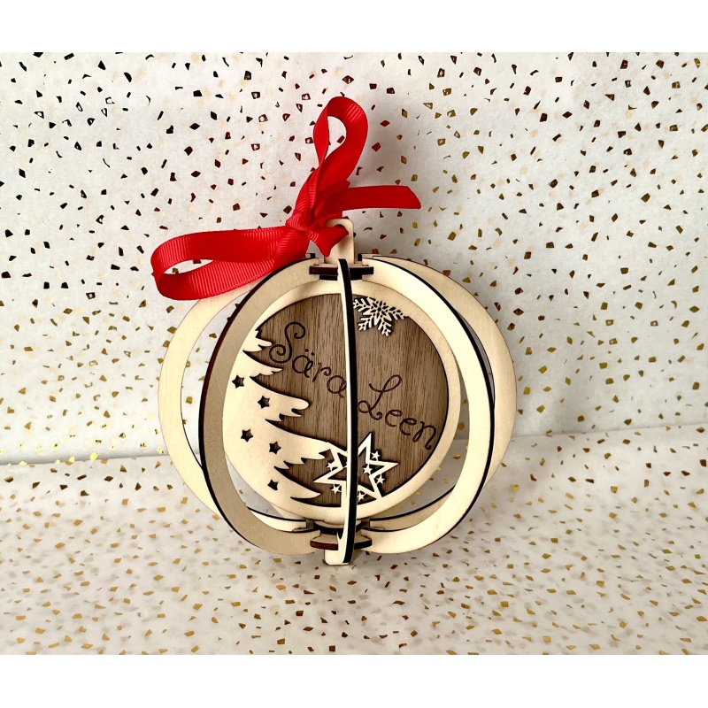 Too jõulupuule eriline sära isikupärase puidust kuuliga, mille keskel on graveeritud nimi või mõni südamlik pühadesoov. Elegantne 3D disain, pähklivineerist sisemine plaadike ja punane pael loovad tähendusliku ja efektse kaunistuse igale kuusele. Täiuslik kingitus jõuluvana kingikotti!
