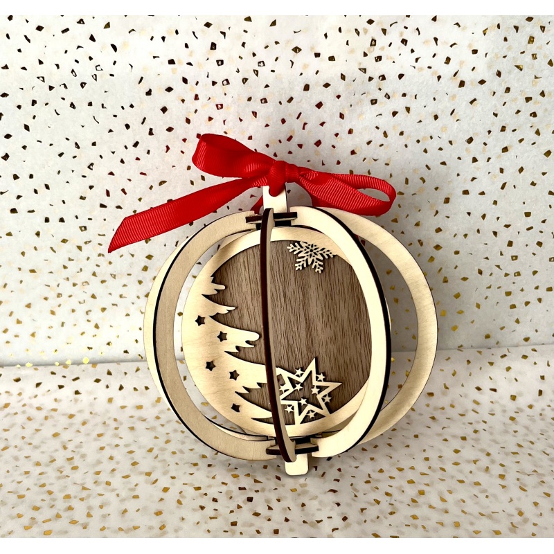 Kuul on valmistatud kvaliteetsest 3 mm vineerist, sisemine plaat on kontrastseks aktsendiks tumepruunist pähklivineerist. Riputamiseks lisab pidulikkust tugev punane lips ning kõik ehted on pakitud musta kinkekarpi läbipaistva aknaga – ideaalne kohe kinkimiseks.