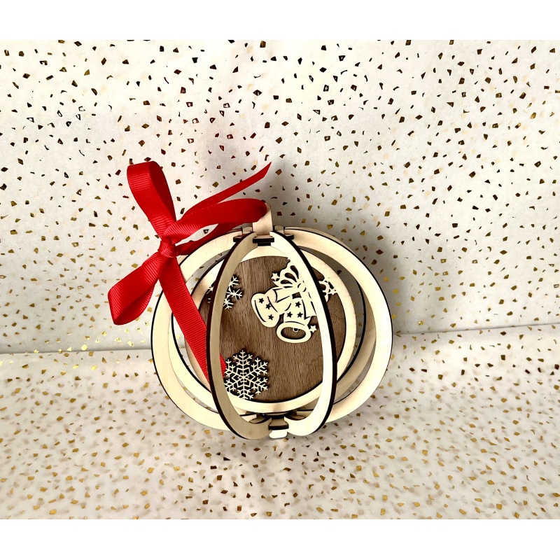 Kuul on valmistatud kvaliteetsest 3 mm vineerist, sisemine plaat on kontrastseks aktsendiks tumepruunist pähklivineerist. Riputamiseks lisab pidulikkust tugev punane lips ning kõik ehted on pakitud musta kinkekarpi läbipaistva aknaga – ideaalne kohe kinkimiseks.