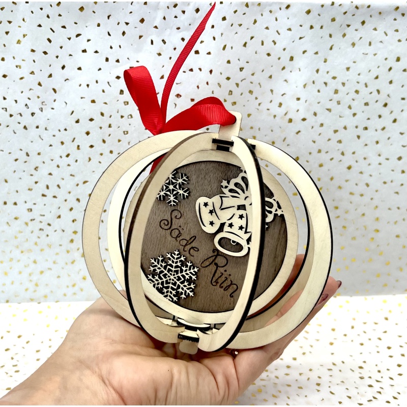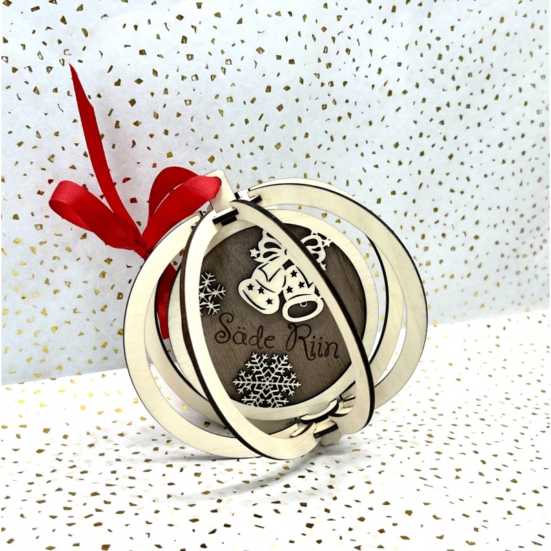 Too jõulupuule eriline sära isikupärase puidust kuuliga, mille keskel on graveeritud nimi või mõni südamlik pühadesoov. Elegantne 3D disain, pähklivineerist sisemine plaadike ja punane pael loovad tähendusliku ja efektse kaunistuse igale kuusele. Täiuslik kingitus jõuluvana kingikotti!