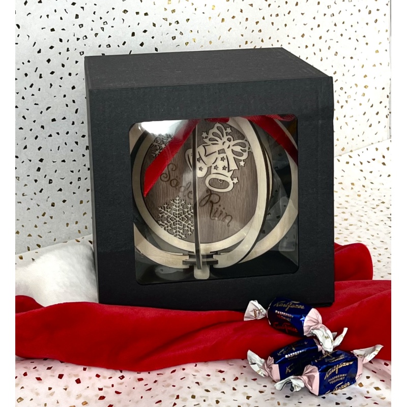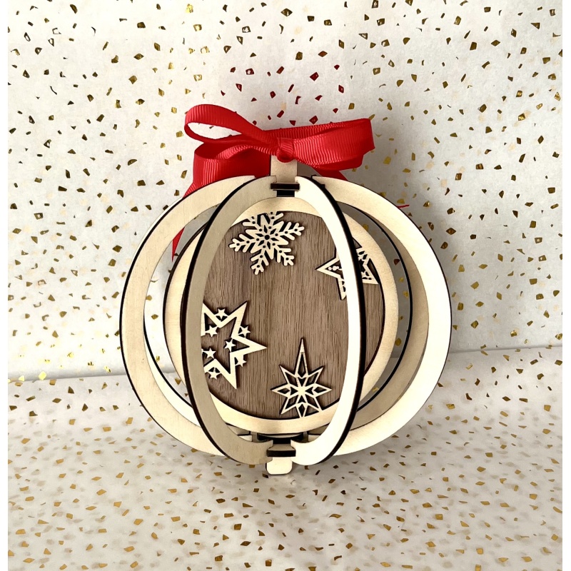Kuul on valmistatud kvaliteetsest 3 mm vineerist, sisemine plaat on kontrastseks aktsendiks tumepruunist pähklivineerist. Riputamiseks lisab pidulikkust tugev punane lips ning kõik ehted on pakitud musta kinkekarpi läbipaistva aknaga – ideaalne kohe kinkimiseks.
